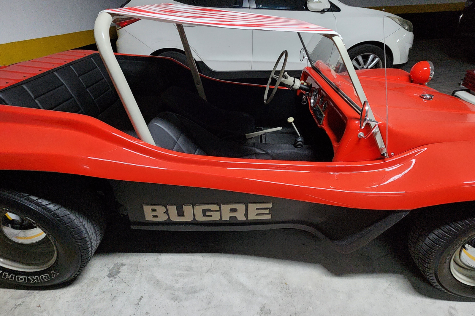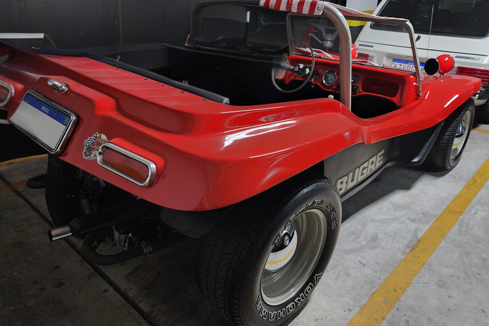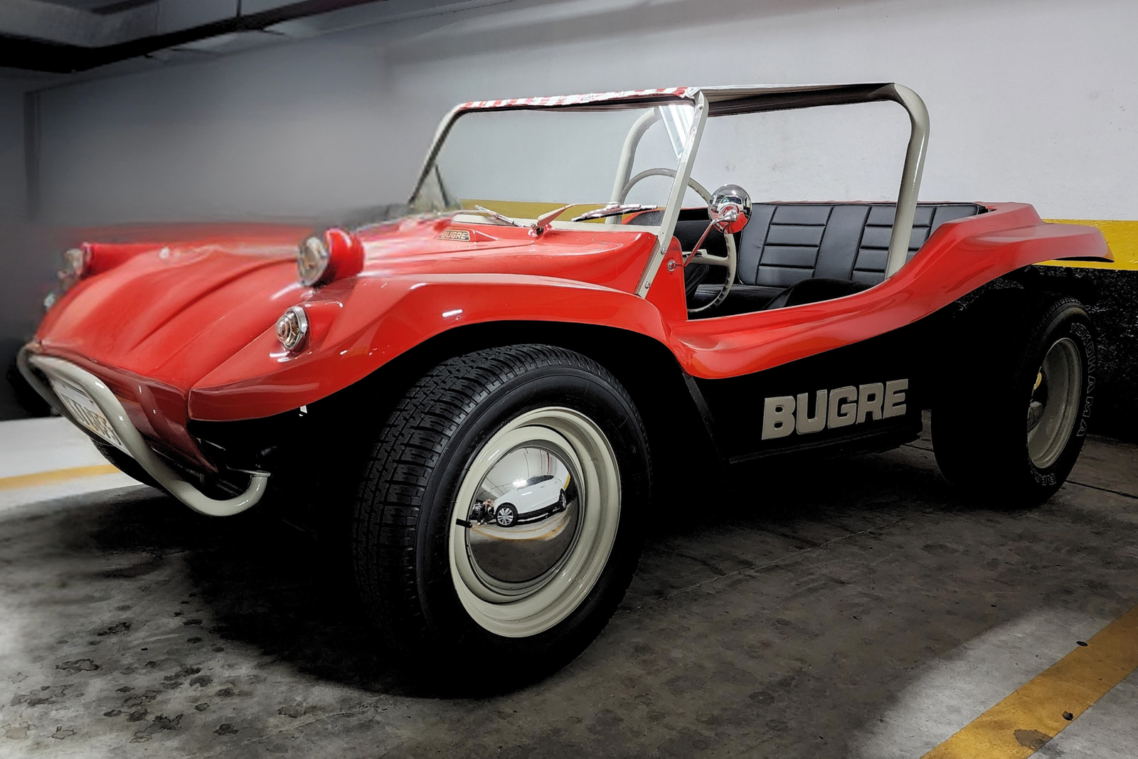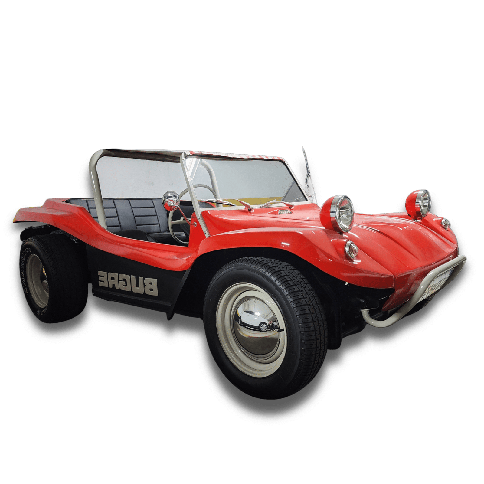 O conjunto preserva elementos icônicos, como bancos originais, painel original com mostradores originais, volante oficial de Fusca da década de 60, além de santo-antônio, retrovisores retrô e rodas no estilo Meyers Manx, que reforçam a estética clássica do dune buggy. O sistema de som está funcional, e o carro se apresenta íntegro em todos os aspectos.