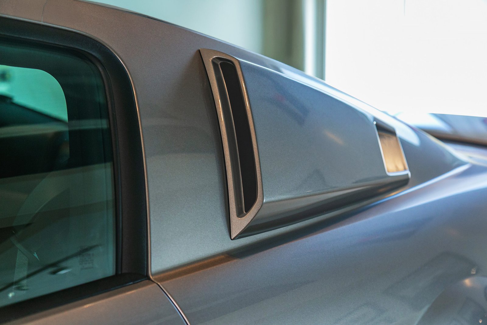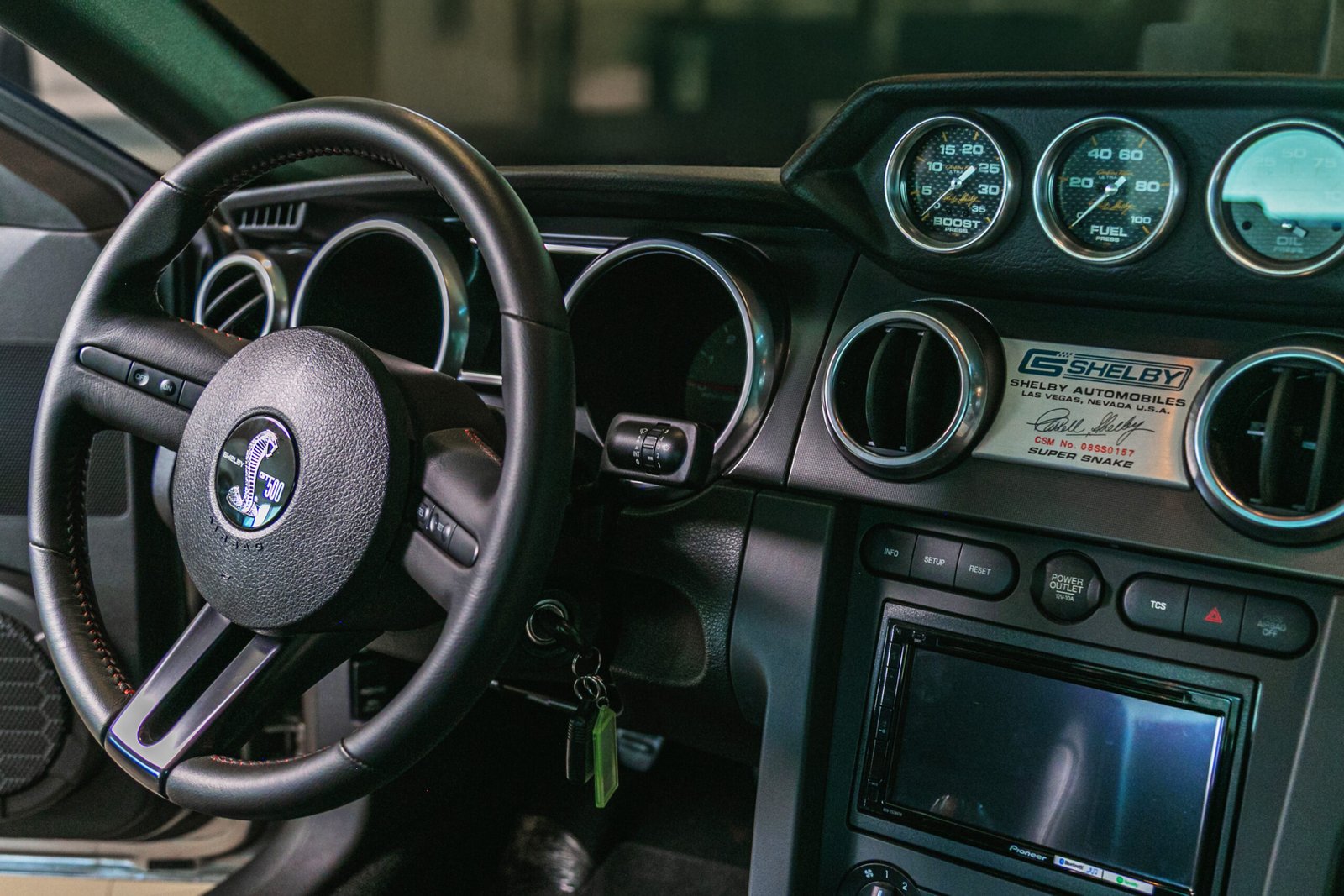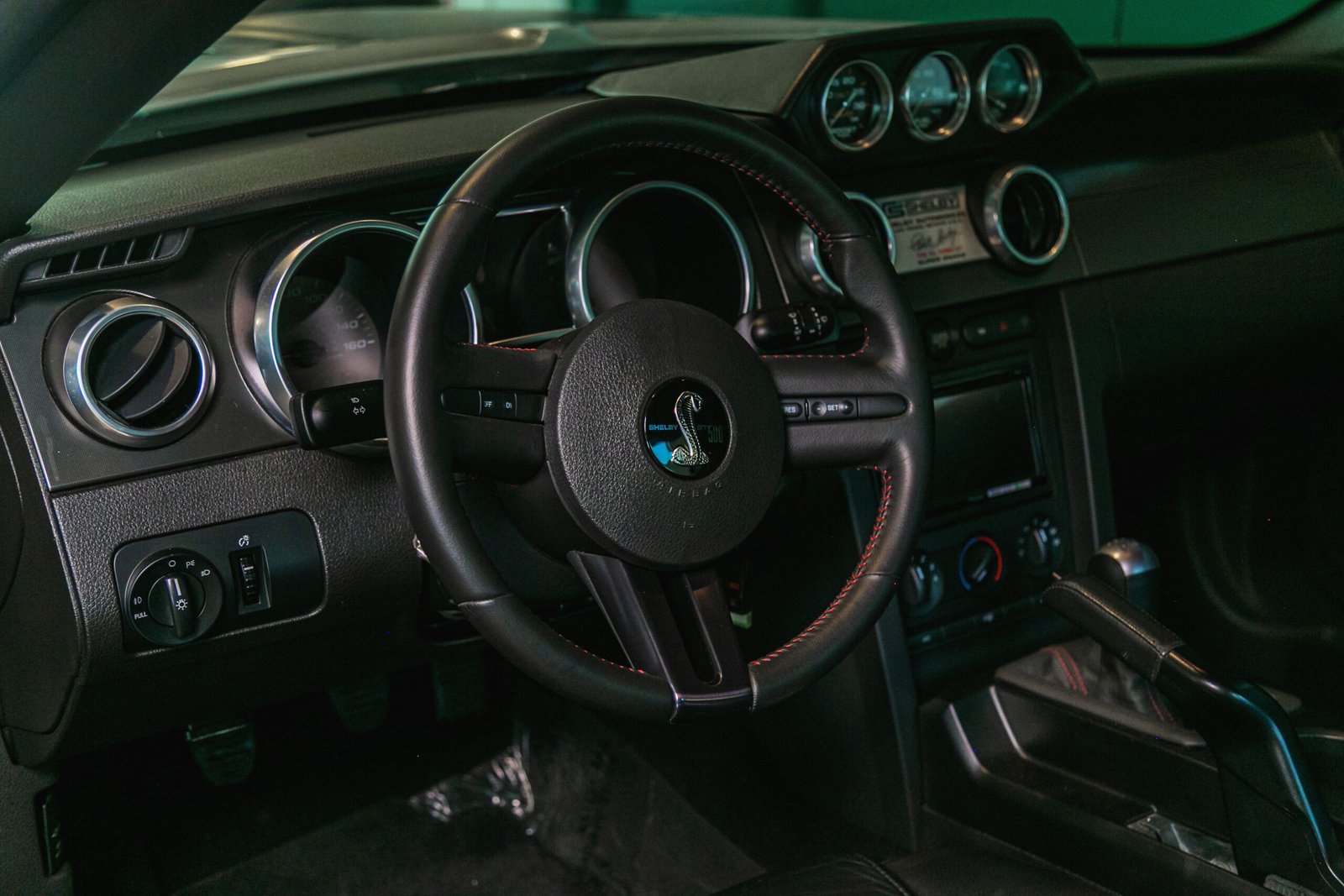 Este exemplar em cinza escuro entrega presença com discrição agressiva. A carroceria traz o kit aerodinâmico exclusivo da Shelby American, com capô funcional, para-choques esculpidos e rodas de alto desempenho. Cada linha do design foi pensada não só para impressionar, mas para performar em alta velocidade.