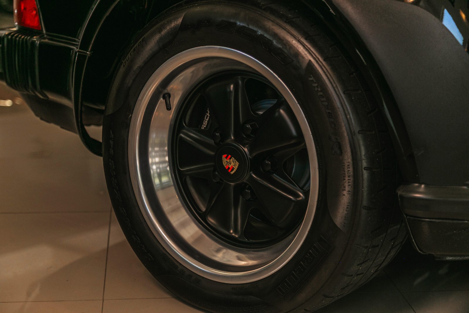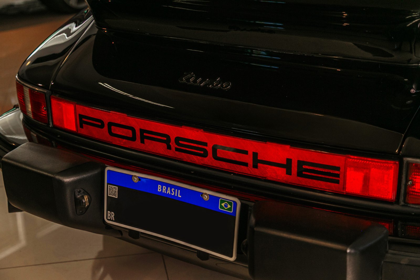A carroceria preta, com linhas clássicas e aerodinâmica precisa, destaca cada curva com discrição e imponência. A icônica asa traseira e o conjunto de rodas largas reforçam o caráter agressivo, sem perder a sofisticação que só um 911 sabe ter.